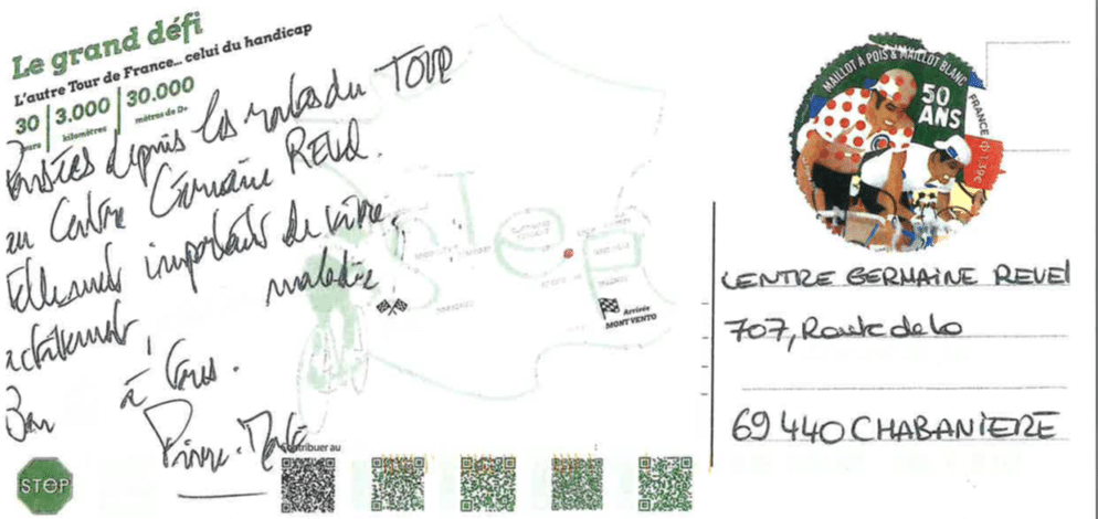 Sur les routes de son défi, Pierre Martin Aubelle nous a écrit ce gentil message, destiné à nos patients qui VIVENT au quotidien AVEC leur maladie.