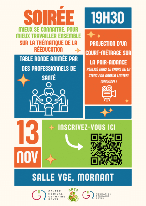 Le mercredi 13 novembre à 19h30 – Salle VGE à Mornant, nous convions les professionnels de santé à une soirée d’échanges organisée par la CPTS des Côteaux Rhodaniens sur la thématique de la rééducation.